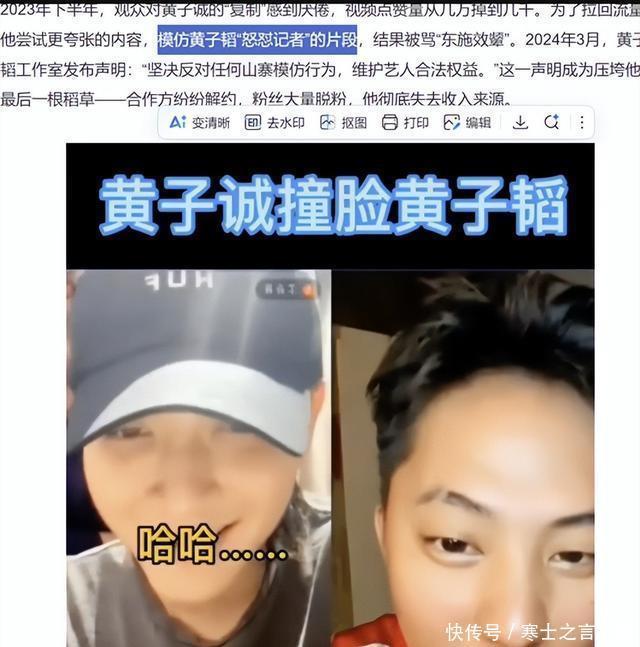 同样是靠明星脸当网红,有人年赚千万、有人喜提劳子,而有人却只能对着镜头哭诉       :就是因为模仿黄子韬,导致我倾家荡产了!       起因是黄子诚打螺丝时,被工友说长得像明星黄子韬,所以就打算以此为卖点起号,毕竟山寨科比都能爆火自己这条件差啥?       于是他正式踏上了山寨名人的赛道:花钱理发做妆造、苦练动作仿真人!       总之皇天不负苦心人,黄子诚的模仿视频刚出就赢得了数万粉丝的认可,甚至还引来了鹿哈、王二博、林俊绝、全治聋等人一起组了个ESO准备出道。       由于他们的模仿太过离谱,所以被不少网友当做乐子推上热搜,一定程度上助力了他们的走红。       只不过�年这几位山寨神人被曝要上芒果综艺以后,ESO就突然在全民热议中走上了颓败之路。       首先被模仿的明星粉丝们不高兴,认为他们是不尊重本尊,其次利用明星脸蹭热度搞商演,恐涉嫌侵权,总之封杀声四起。       后续ESO虽然辟谣即将录综艺的谣言,但还是挡不住紧急避险,至此山寨男团出道即解散,成员们又回到了要自谋生路的起点!       不过由于鹿哈的鹿晗含量太高,即便组合解散单飞也能实现年�万的明星梦,反观黄子诚就惨了些。       ESO刚出道的时,许多黄子韬的粉丝爱屋及乌,但随后黄子诚就被扒出已婚身份,这被粉丝看来等同于塌房。       但更塌房的是网友刚刚扒出他结婚的消息,黄子诚就迫不及待的释放恢复单身的信号,还与其他网红合作炒CP热度,这在网友看来是极其不负责任的行为。       所以再度加重了观众缘流失,此时黄子诚在热度方面早已不知与恢复真名的鹿哈差了几个等级。       男人的通病是什么?       是怕兄弟吃苦,       又怕兄弟开路虎!       鹿哈都功成名就让黄子诚单纯认为只要自己肯投入,也能换来财富自由的结局!       于是将积蓄取出、将接送孩子的车子卖掉,将钱全部投进自媒体运营希冀东山再起,结果东山没起来西墙还塌了。       2023年黄子诚被爆患癌,恰逢晒儿子视频秀亲子情,心软的粉丝们虽然不知消息真假,但还是涌进账号给他打气,希望他早日康复亲口在儿�岁的时候告诉他父亲是谁,而不是由粉丝转告。       此外粉丝还给他出招续命,比如除了模仿外形之外要形成个人特色,最起码鹿哈单飞还能成功,就是因为踩着山寨明星的热度展现了自我!       但面对粉丝们的建议时黄子诚支支吾吾,唱歌跑调赖伴奏没调好、问他有没有自己的代表作,哪怕是花钱买的也行时,他又说自己只想着模仿真人,没想过学习才艺!       甚至团队建议他改个名字重新开始,他都以“改名粉丝不认”的理由拒绝。       可见除了一张明星脸,黄子诚的肚子里是半分存货都没有,可想而知当观众审美疲劳、热度浪潮褪去后黄子诚必然要成为沙滩上搁浅的鱼。       比如�年下半年开始,他的视频点赞量就开始从几十万巅峰,跌进了破万都难的低谷期,为了博眼球他选择自撅后路博热度,夸张的模仿起了黄子韬“怒怼记者”的片段。       这不仅是东施效颦更是吃饱了骂厨子的操作,毕竟此前黄子韬连麦他时,并没有恼怒对方蹭热度,还苦口婆心的劝他要做自己、生新枝!只是他没听,才因为违反平台规定被封号处理。       而黄子诚在对镜头哭诉自己破产时也说明了,红的时候𱁩.9元包邮的数据线都能爆单,现如今账号粉丝再多,但用不了也只能成为记录辉煌的废号。       更尴尬的是由俭入奢易,由奢入俭难,据说他即便兜里没钱也要维持雇佣助理、穿名牌的“名人生活”,最终劳子没混上却穷到差点想进牢子混饭。       但即便饿到头昏眼花,黄子诚好似还没明白自己的问题在哪,仍旧坚称模仿最多算恶搞,想不通为什么会被封号,怀疑被资本做局等等!       总之黄子诚看着家里卖不出去的囤货无语凝噎,时刻质问为什么幸运女神的手只是短暂的摸了他一下?       短暂的触碰到了翻身机会,却没踩稳向上攀爬的阶梯,不止没有出人头地还失去了自己、失去了曾经相濡以沫的妻子!       一无所有的黄子诚在视频最后,坚定的告诫其他人要做自己,因为太阳一落山,哪怕是实心的影子也会变成小透明!       就像他现在一无所有的局面,所以模仿一颗当做“敲门砖”,但不能活成“铁饭碗”,脚下的道路,终还是要靠自己走出来才结实。